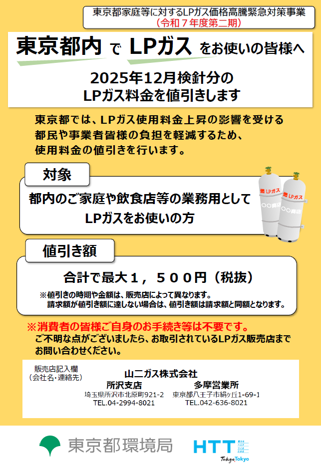 このような社会情勢を鑑みて、家庭・企業の負担軽減を図ることを目的に、「東京都家庭等に対するLPガス価格高騰緊急対策事業」が実施されております。