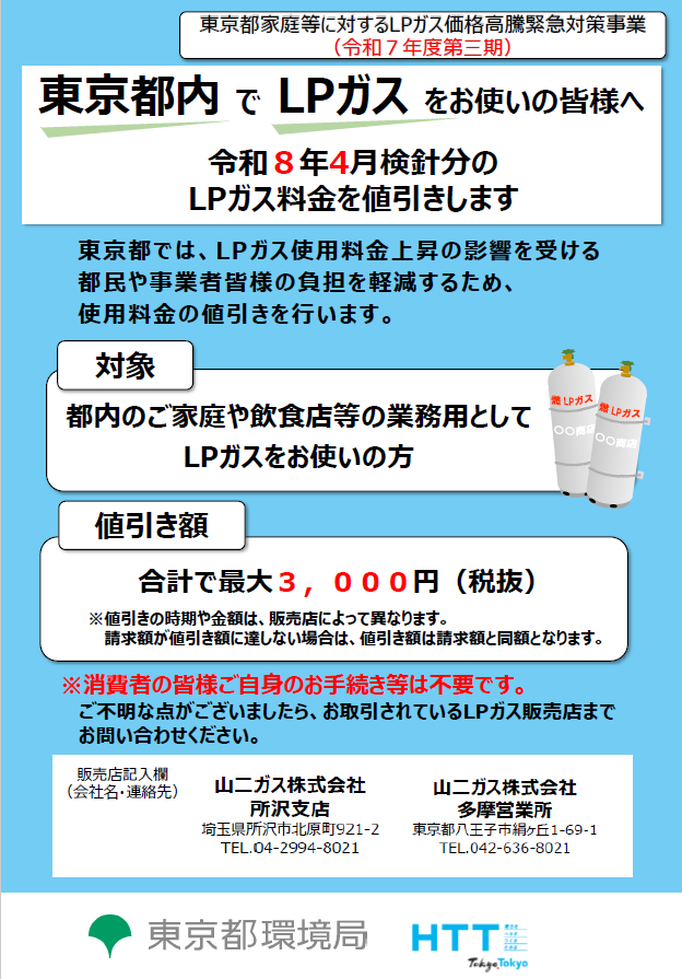 このような社会情勢を鑑みて、家庭・企業の負担軽減を図ることを目的に、「東京都家庭等に対するLPガス価格高騰緊急対策事業」が実施されております。